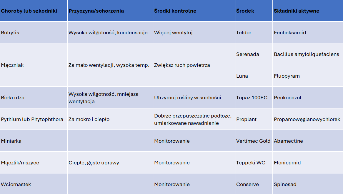 Uniwersalne zalecenia uprawowe dla chryzantemPodłoże uprawne Żyzne i dobrze przepuszczalne Zabezpieczenie wystarczającej ilości wilgoci i składników odżywczych, aby utrzymać uprawy w dobrej kondycji pH powinno być utrzymywane w zakresie 5,8-6,2 Nawadnianie i światło Upewnij się, że woda dokładnie wsiąka do doniczki Nigdy nie pozwól, by uprawy były przesuszane we wczesnym etapie uprawy Nadmierna ilość wody w trakcie uprawy może powodować gnicie korzeni Preferowane są systemy nawadniania kroplowego lub deszczowanie Chryzantemy są roślinami pełnego słońca - półcień i słabsze światło światło skutkuje słabszymi roślinami Zalecane dawki nawożenia Wczesny etap 0,5 – 1,0 EC od 17-5-17 (N-P-K) Po pełnym rozwoju korzeni i w celu zwiększenia rozmiarów roślin zwiększenie dokarmiania do 1,5-2,0 EC z 20-10-20 Po zastosowaniu wyższych dawek EC powrót do niższych dawek dokarmiania w fazie tworzenia paków do 1,0-1,5 EC z 17-5-17 Uzupełniające nawożenie bezpośrednio po intensywnych opadach Opóźnienie cieplne Opóźnienia w produkcji mogą wystąpić z powodu wysokich temperatur: zazwyczaj w ciągu dnia powyżej 35°C, a nocą powyżej 27°CTo ogólne wytyczne - mogą się różnić w zależności od odmiany i środowiska uprawy W okresie skracanie dnia, upewnij się, że pod czarną tkaniną nie wytwarza się za wysoka temperatura Zarządzanie wzrostem Wskazówki dotyczące wysokości Ogólne zasady dotyczące wzrostu roślin na początku krótkich dni: Roślina bez regulatora wzrostu wydłuża się średnio o około 2,5 cm tygodniowo Wysokość rośliny (wliczając wysokość doniczki) powinna wynosić około 60% pożądanej wysokości / szerokości końcowej Chociaż te wytyczne nie zawsze dotyczą wszystkich odmian i sytuacji, są dobrą regułą Rozwiązywanie problemów Czynniki prowadzące do słabego wzrostu: Rośliny mają zbyt mało długich dni uprawowych przed rozpoczęciem krótkich dni Rośliny przedwcześnie wypuszczają pąki kwiatowe: Wysokie EC w podłożu uprawowym Przesuszanie roślin w trakcie uprawy Czynniki prowadzące do nadmiernego wzrostu rośliny: Za długi okres uprawy w fazie długiego dnia Rośliny rosną zbyt gęsto Nadmierne nawożenia azotem Regulacja wzrostuW razie potrzeby można użyć następujących środków (zobacz etykietę produktu z wytycznymi dotyczącymi użytkowania): Daminozyd (B-Nine®) Paklobutrazol (Bonzi®) B-Nine® i Bonzi® opóźnią kwitnienie, jeśli zastosuje się się po tym, jak pąki osiągną wielkość groszku Opóźnione stosowanie Bonzi® może być używane do utrzymania upraw na pożądanej wysokości, ale możliwe jest opóźnienie kwitnienia. Należy również zwrócić uwagę na wydłużony okres działanie preparatu (unikać oprysku na powierzchnie pod inne uprawy) Rozstawa Rośliny rozstawione na tyle, by umożliwić powstanie kopczastego, zaokrąglonego kształtu i swobodnego przepływu powietrza Niewystarczające odstępy powodują: Rośliny pionowe/niepożądane kształty Słabe rośliny Żółknięcie dolnych liści Zwiększają ryzyko chorób Choroby i szkodniki - kliknij na grafikę na dole artykułuZa wczesne pąkowanie Profilaktyka – klimat Utrzymuj nocne temperatury powyżej 18°C Upewnij się, że rośliny są w fazie długiego dnia Krytyczna długość dnia potrzebna do utrzymania wzrostu wegetatywnego to 15 godzin lub dłużej W razie wątpliwości uzupełniaj dawkę minimalnie 70-80 luksów (mierzonych na wysokości upraw) między 22:00 a 2:00 w nocy Ogólne informacje Wywoływany wczesny pąk przez dwa czynniki: Krótki dzień Niskie temperatury Wysoki poziom nawożenia nie opóźnia wczesnego rozwijania pąków Niska wilgotność + wysoka temperatura = wczesne zawiązywanie pąków